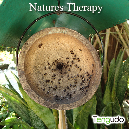 フィリピンにはStingless Beesという刺さない蜂がいます。ソニアズガーデンでは、こんな風に養蜂箱が枝から下がっています。